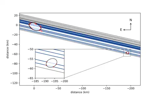 On 27 March 2022, multiple astronomers observed a stellar occultation by Polymele, which revealed an apparently elongated projected shape with projected dimensions of 26.2 km × 12.8 km (16.3 mi × 8.0 mi).[15] Additional occultation observations of Polymele from 2020 to 2023 revealed that Polymele's true shape is a highly flattened disk with dimensions 27.0 km × 24.4 km × 10.4 km (16.8 mi × 15.2 mi × 6.5 mi), similar to the large flat lobe of the Kuiper belt object 486958 Arrokoth.[16] This unusual flattened shape of Polymele implies that it had retained its original shape from when it formed by accretion.[16]