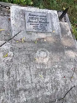 Bryansk Front had been formed on August 14, under command of Lt. Gen. A. I. Yeryomenko. The STAVKA was planning a general counteroffensive by Western and Reserve Fronts to begin August 30-September 1, and Yeryomenko was ordered to support this with a general offensive of his own.[13] The 151st was in no position to take part in this as it had been withdrawn into the Front reserves for rebuilding;[14] although it had not lost its battle flags or combat documents and its staff was still largely intact, its losses in manpower and equipment had been very large. On August 20 General Neretin had been given command of the 266th Rifle Division while retaining his position in what remained of the 151st. In early September the 2nd Panzer Group began moving past Bryansk Front to begin the encirclement of Southwestern Front east of Kyiv. The encircling pincers met on September 14, and under the circumstances there was no possibility of rebuilding the division, and on September 16 it was disbanded to provide replacements for other units of Bryansk Front.[15] Neretin had already been killed in action on August 30 while leading units of the 266th, and was buried near Snovsk.