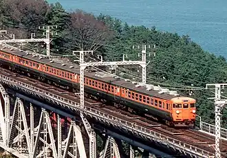 ![]() A JNR 153 series EMU in "Shonan" livery on a Tokaido Main Line Izu service | |