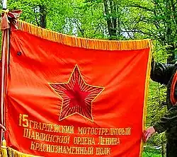 By the beginning of the war, it was called the 875th Infantry Regiment of the 127th Rifle Division (1st Formation).[2] The regiment fought in the Eastern front battles of Smolensk and Kursk, as well as the Novorossiysk-Taman operation. The regiment took part in the occupation of Ukraine and Lithuania. For its wartime actions, the regiment was raised to "Guards" status as the 15th Guards Rifle Regiment. For the occupation of the Lithuanian city of Šiauliai during the Šiauliai offensive the regiment received the honorary title "Shavlinsky."[1][3]