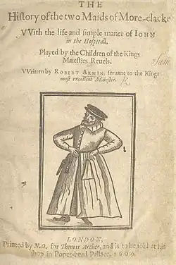 Title page of Robert Armin's The History of the two Maids of More-Clacke. The woodcut shows Armin onstage.
