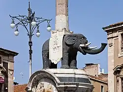Rocks erupted in 1669 have been quarried,[4] especially after the 1693 earthquake[21] when they were used during the reconstruction of the city.[111] Lava was used to pave roads, for constructions, and later for architectural elements, the production of bituminous conglomerate, concrete, and statues[21] such as the Fountain of the Elephant in Catania.[112] The present-day port of Catania is attached to the 1669 lava flow.[113] Elsewhere in Catania, the lava flow is mostly hidden.[40] In 2022, the government of Sicily defined 11 March a day of remembrance of the 1669 eruption.[114]