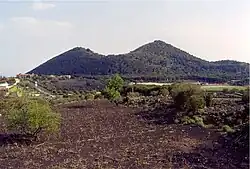 The about-200-metre (660 ft)-high and about 1-kilometre (0.62-mile) wide Monti Rossi scoria cone was formed by the 1669 eruption.[23] It consists of two overlapping cones[26] or a cone with two summits[12] that was constructed by intense lava bomb and volcanic ash fallout that was observed by eyewitnesses. This cone was named "Mount of Ruin" after the eruption[1][78] and was then renamed Monti Rossi (Red Mountains), either to cancel the memory of the destructive eruption[14] or after its color.[79] It is a prominent landmark.[80]