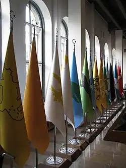- ^ a b c Ivan Sache, Presentation of the Sixteen Great Turkish Empires and their alleged flags, Flags of the World, 4 July 2004; cf. jpeg of the 1984 stamp series. The flags were designed by Özbek in 1969. They are mostly imaginary, with the exception of the 1844 Ottoman flag, and arguably the wolf's head and the bow-and-arrow used as emblems for the Göktürk and the Seljuk states, respectively. Ekrem Buğra Ekinci, 16 TÜRK DEVLETİ Cumhurbaşkanlığı forsundaki 16 yıldız neyi ifade ediyor?, 2 February 2015.