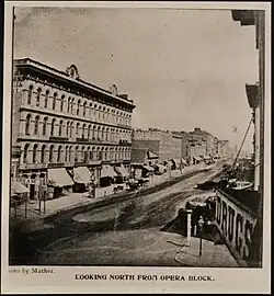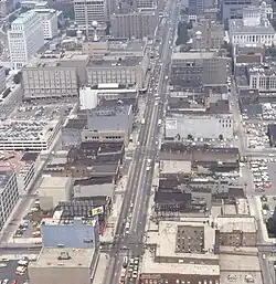In February 1905, buildings on the site were set to be torn down and replaced with the Jamison Block; the New Bargain Store at the corner of Walnut and High advertised a sell-out sale, announcing it was being forced to vacate.[37] The new Jamison Block building was planned as a four-story red sandstone and buff brick structure, with designs by Monroe Heath Blake.[34] It was also planned to have the High Street entrance arcade and waiting room for the Scioto Valley Traction Company, which built an interurban train station nearby, facing Front Street. The company's officials abandoned the Jamison Block plans when they realized Columbus was no longer "High Street, Ohio" (a one-street town).[31][38] The present-day 185–191 S. High Street was constructed in 1906, known as the Jamison Block.[31] One of its significant tenants was the Bliss Business College, a school formerly located in the Grand Theatre on State Street. The college opened in the new building on September 4, 1906; a Columbus Dispatch article that year reported Bliss would have the only business college in the state occupying a building specifically built for its purpose.[5] The building suffered two fires in April 1910. The second fire destroyed the inventory of the A.G. Spalding & Co.'s store, with losses to other tenants including Bliss College, F.H. Siebert's cigar store, Theresa Hermann's millinery, and K.F. Farrah's store selling Syrian goods.[4] Several months after the fire, in October 1910, W.L. Jamison commissioned architect J.A. Jones to design a garage building behind the Jamison Block. The building is still extant at 200 South Wall Street, standing 62 feet (19 m) square, two stories in height.[39]