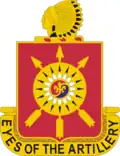 The unit's insignia was approved on 10 May 1972.[2] It is a gold coloured metal and enamel device, 1+3⁄8 inches (3.5 cm) in height. It consists of a coat of arms with a shield, crest and motto. Three arrows symbolize the unit's three assault landings at Sicily, Naples-Foggia and Southern France. The arrows with the buckskin shield also symbolize Oklahoma's Indian heritage, (a depiction of a buckskin shield is found on the state flag of Oklahoma). The sunburst design, a favorite Indian symbol, alludes to the unit's mission to provide general target acquisition, survey and meteorological support to the artillery with a corps. The sixteen stylized rays symbolize the sixteen battle honors of some elements of the organization. The fleur-de-lis represents the unit's service in Europe, World War II. The taeguk alludes to the organization's participation in the Korean War.