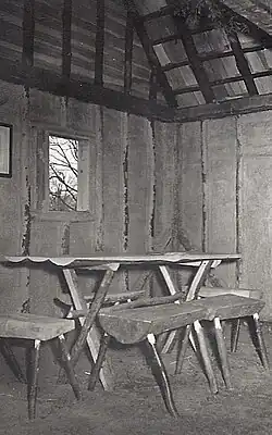 Built with regulation dimensions, the 1753 House is quite small by modern standards. Using mortise and tenon joints, the walls and frame are made of oak timbers harvested from nearby White Oak woods. The roof uses split shingling. The interior includes a few historical replicas, such as a table, a bench, and fireplace cooking instruments. A loft covered in pine branches, about 7 feet above the dirt floor, provides a sleeping area closer to the chimney, which emanates heat. A large stone chimney serves as the central focal point of the building.