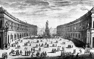 Louis XIV distrusted the Parisians; when he was young he had been forced to flee the city twice, and he did not forget it. He moved his residence from the Tuileries Palace to the Palace of Versailles in 1671, and moved his entire court to Versailles in 1682. But while he disliked the Parisians, he wanted Paris to be a monument to his glory; he declared in 1666 that he wished to "do for Paris what Augustus had done for Rome."[1] He decorated the city with new squares and public buildings; the Collège des Quatre-Nations (1662–1672); the Pont Royal in 1685, and in the same year began construction of two new monumental squares: Place des Victoires and Place Louis le Grand (now Place Vendôme). He also began the Hôtel des Invalides (1671–1678), a residence and hospital for wounded soldiers. In 1699, a monumental equestrian statue of the King was dedicated in the center of the place Vendôme. During his reign, Louis XIV spent more than 200 million livres for new buildings, of which ten percent was spent in Paris; ten million for rebuilding the Louvre and the Tuileries; 3.5 million for the new factories of Gobelins and the Savonnerie; and a little more than 2 million for Les Invalides.[2]