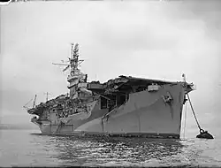 In June, the squadron phased out this variant, taking possession of twenty-one Vought Corsair Mk IV, before relocating to RNAS Belfast (HMS Gadwall), County Antrim, on 29 June.[3] Three weeks after their arrival at RNAS Belfast, the squadron boarded the Ruler-class escort carrier, HMS Premier, on 25 July for a week of rigorous Deck Landing Training (DLT).[11] The squadron returned to RNAS Belfast on 2 August. The squadron was earmarked for the 17th Carrier Air Group of the British Pacific Fleet, but following the announcement of Japan's surrender on 15 August, the squadron's future became unclear. On 23 August, they moved to RNAS Nutts Corner (HMS Piintail), County Antrim, where they were scheduled to disband on 3 September 1945.[5]