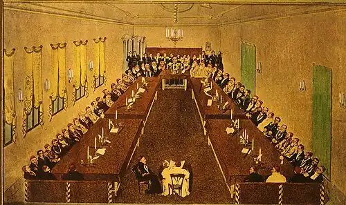 In vague terms, the firman also included provisions for the election of a new prince by males of "all classes", seen by boyars and nationalists alike as a restoration of the ancient Vlach law.[43] Election was to be done by an Extraordinary National Assembly, and the Caimacami and the Council of Ministers were tasked with designing rules for the electoral race, beginning with the voting age, set at 30. There were in all 190 or 191 members,[44] a number later set at 188.[45] In accordance with the table of ranks, 50 of these were 1st Class boyars, who were electors ex officio, as were three bishops.[46] 73 more delegates were sortitioned from a pool of 2nd and 3rd Class boyardom, 36 more were elected by the qualified boyars from the counties, with 26 more deputies representing the urban guilds.[47] Bibescu's son and biographer, Georges Bibesco, argues that the representation of guilds and counties meant that the race of 1842 was the first in history to signify election "by the country", being in this more liberal than 18th-century precedents.[48]