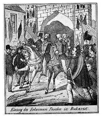 Faced with the clear hostility of the Russian Emperor Nicholas I, Wallachian revolutionaries sought instead a rapprochement with the Ottoman leadership.[41] Efforts were made to clarify that the movement did not seek to reject Ottoman suzerainty: for this purpose, Ion Ghica was sent to Istanbul as early as May 29, 1848; his mission was initially successful, but later events led Sultan Abdülmecid I to reconsider his position, especially after being faced with Russian protests.[42] Süleyman Pașa, Abdülmecid's brother-in-law, was dispatched to Bucharest with orders to report on the situation and take appropriate measures.[36]