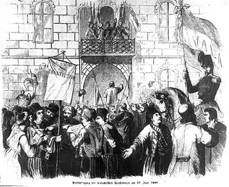 Rebellion broke out in late June 1848, after Frăția's members came to adopt a single project regarding the promise of land reform.[15] This resolution, which had initially caused dissension, was passed into the revolutionary program upon pressures from Nicolae Bălcescu and his supporters.[15] The document itself, destined to be read as a proclamation, was most likely drafted by Heliade Rădulescu, and Bălcescu himself was possibly responsible for most of its ideas.[15] It called for, among other issues, national independence, civil rights and equality, universal taxation, a larger Assembly, responsible government, a five-year term of office for Princes and their election by the Assembly, freedom of the press, and decentralization.[15]