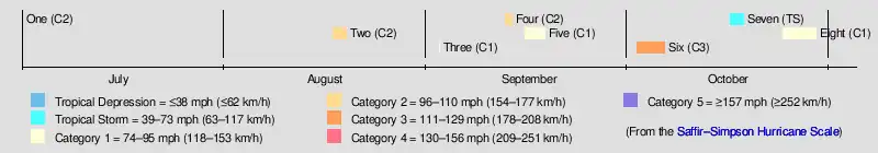 | Five | September 15–18 | Category 1 hurricane | 80 (130) | 982 | Eastern United States (Alabama) | >$10,000 | 2 | [6][7] | ||