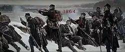 1864 was produced by Miso Film for DR. It was a co-production with Film Fyn, TV2 (Norway), TV4 (Sweden), SF Studios, ARTE, ZDF Enterprises and Sirena Film (Czech Republic).[1] DR had recently produced the highly successful series The Killing, Borgen and The Bridge,[2] and several of the stars of those series, such as Lars Mikkelsen, Sidse Babett Knudsen and Søren Malling, were among the cast.[3] 1864 was filmed on location at Dybbøl, scene of the climactic battle of the war, in the Svanninge Hills on Funen, and at Hagenskov, Egebjerggård and Hvidkilde Manors, also on Funen.[2] The battle scenes were filmed in the Czech Republic over a period of seven weeks.[4] Tom Buk-Swienty, on whose books the series was based, was a historical consultant on the series.[5] It was the most expensive television series ever made in Denmark, with a projected cost of 173 million kroner (about $25 million).[5]