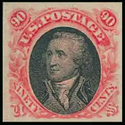 The July essays assigned Lincoln to the 10-cent value, while the 15- and 24-cent tableaux were accompanied by a third historical scene for the 30-cent denomination, drawn from John Trumbull's painting The Surrender of General Burgoyne at the Battle of Saratoga (this design was never produced in two colors, but has been conjecturally colorized here in the approximate shades of the 30-cent stamp that was issued). After Lincoln had been moved to the 90-cent stamp, a 10-cent version of the Signing of the Declaration was mooted, but around September, National provided the present Eagle-and-Shield design for the denomination. Late in production, the Post Office eliminated the Burgoyne stamp, fearing it would offend the British. The resulting vacancy in the series was filled by an ingenious adaptation of the Eagle and Shield: this tableau appears in red on 30-cent value, framed by flags, stars and halations of light printed in blue (while the flags are monocolored, the general red, white and blue impression of the stamp as a whole carries over to them). Many years later, during 1927, another engraving of Trumbull's painting would appear on a 2-cent sesquicentennial commemorative (prompting no British objection); and during 1994 the original Burgoyne 1869 tableau was finally issued on a stamp in a replica, printed entirely in blue but now somewhat enlarged in size and valued one dollar rather than the original 30-cents.[11] The Postal Service labeled this stamp "The Battle of Saratoga", downplaying the tableau's aspect as an image of English defeat.