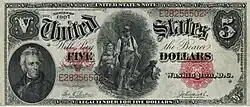 The note was the last $5 denomination that carried Andrew Jackson's likeness.[3] The central portrait is thought to represent a pioneer family moving west. Example of the notes printed in the series of 1869 show that paper with a blue tint was used.[4] The 1869 series also is referred to as a "Rainbow Note" based on the notes blue tint, red serial number and seal and a green hue.[5][6]