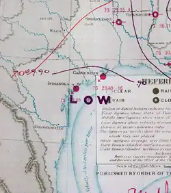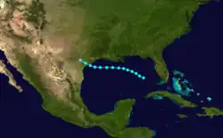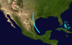 On September 2, a tropical storm developed in the Bay of Campeche. Moving generally towards the west-northwest, the storm reached a peak intensity of 60 mph (95 km/h) on September 4, while approaching northeastern Mexico. Shortly thereafter, the cyclone made landfall in northern Tamaulipas and weakened into a tropical depression on September 5, several hours after crossing into Texas. Moving northward through the state, the storm dissipated on September 7, while located to the southwest of the Dallas–Fort Worth area.[3] Chenoweth argued that this system developed as a tropical depression near the central Gulf of Mexico on September 1 and became much more intense, reaching Category 3 intensity on September 5. The system struck south Texas later that day.[5]