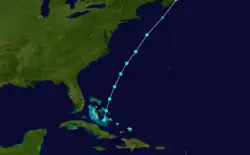 Observations from Cuba and Jamaica indicated that a storm existed to their northeast on September 24.[25] Consequently, the track listed in HURDAT begins about 150 mi (240 km) northeast of the Dominican Republic. The cyclone moved west-northwestward, crossing through the Turks and Caicos Islands and the Bahamas, striking or passing near many islands including Acklins, Crooked Island, and Long Island before turning in a general northward direction east of Andros on September 26. Thereafter, the storm passed near or over islands such as New Providence and Grand Bahama before exiting the Bahamas on the next day. After passing the Bahamas, the cyclone moved parallel to the southeastern coast of the United States and intensified to sustained winds of 60 mph (95 km/h) on September 28,[3] based on reports from the ships Magnolia and Gulf Stream and Cape Henry, Virginia.[10] On September 29, the storm was last noted about 115 mi (185 km) east-southeast of Buxton, North Carolina.[3]