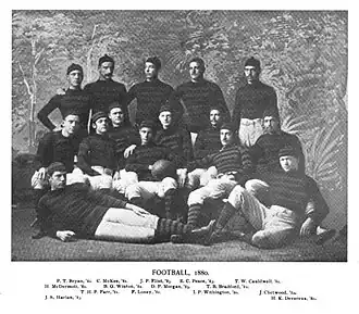 The 1880 Princeton Tigers football team represented the College of New Jersey, then more commonly known as Princeton College, in the 1880 college football season. The team finished with a 4–0–1 record and was retroactively named co-national champion by the National Championship Foundation and Parke H. Davis.[1][2] This season was Princeton's tenth national championship and one of 11 in a 13-year period between 1869 and 1881.[3] The captain of the team was Francis Loney.[4]