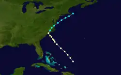 Land-based observations from the Gulf Coast of the United States attest to the existence of this storm beginning on August 16,[18] while the cyclone's track in HURDAT is listed as beginning close to Cozumel. Moving northeastward on August 16 and then east-northeastward on the next day, the system avoided striking Cuba and Florida as it traversed the Straits of Florida. However, the cyclone resumed a northeastward motion on August 17 and passed through the Bahamas between then and early on the following day, making landfall on the Abaco Islands.[5] Based on reports from the ships Anna and Cohasset, the storm intensified into a hurricane on August 19 and peaked with winds of 80 mph (130 km/h).[5][6] It weakened to a tropical storm on August 21 and became extratropical the same day approximately 280 mi (450 km) east-southeast of Sable Island, Nova Scotia.[5]