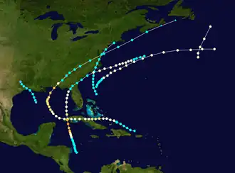 | Two | September 2–12 | Category 3 hurricane | 125 (205) | 949 | Turks and Caicos Islands, Bahamas, Cuba (Camagüey Province), Gulf Coast of the United States (Florida), East Coast of the United States | >$100,000 | >1 | [9][10] | ||