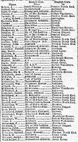 Extract from Scottish FA minutes from 2 December 1884 listing players who had moved to English clubs