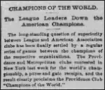 In 1884, Metropolitans manager Jim Mutrie issued a challenge to his NL counterpart, Frank Bancroft of the Grays. Mutrie's challenge was for a best-of-three series. Each team would put up a thousand dollars with the winner taking all.