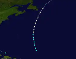 A ship known as Inflexible first encountered this storm over the central Atlantic to the east-southeast of Bermuda on September 1.[38] Moved northwestward, the cyclone became a hurricane on the following day. Turning northeastward,[7] the storm likely intensified further, based on several ship reports, including the steamship Taormina recording a barometric pressure of 963 mbar (28.4 inHg).[39] The Atlantic hurricane reanalysis project thus estimated that the cyclone became a Category 2 hurricane with maximum sustained winds of 105 mph (165 km/h),[5] while Fernández-Partagás and Diaz suggested that it may have strengthened into a major hurricane.[39] On September 4, the storm transitioned into an extratropical cyclone about halfway between Greenland and the Azores. Thereafter, the extratropical storm persisted until September 6, when it dissipated off the coast of Ireland.[7]