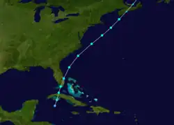 Maritime observations indicated the presence of a tropical storm over the northwestern Caribbean as early as June 15.[7]: 24 Moving north-northwestward, the cyclone struck the Guanahacabibes Peninsula of Cuba several hours later, likely as a minimal hurricane with sustained winds of 75 mph (120 km/h),[6] according to a study of wind damage conducted by meteorologist Ramón Pérez Suárez in 2000.[4] However, the hurricane weakened back to a tropical storm shortly after reaching the Gulf of Mexico on June 16. Gradually curving northeastward on June 17, the system made landfall near Cedar Key, Florida, with winds of 50 mph (85 km/h) around 14:00 UTC. After emerging into the Atlantic from the First Coast on the following day, the system remained closely offshore Georgia, South Carolina, and North Carolina. The cyclone was last noted on June 20 about 115 mi (185 km) southwest of Sable Island, Nova Scotia.[6]