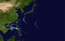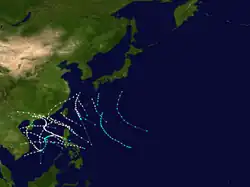 On May 18 a typhoon appeared to the east of Visayan Islands and moved inland on May 21. After crossing over into the South China Sea the storm moved northward. It passed through the Taiwan Strait between the 26 and 27 of May. On May 28 the storm was pushed out to sea by an advancing cold front and absorbed on May 29.[21][22]