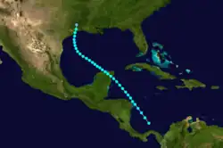 Although Fernández-Partagás and Diaz did not confirm information about this storm before September 18, they opted to retain the track back to September 12 for continuity with previous reanalyses.[10] The storm initially moved slowly northwestward and turned west-northwestward on September 14. Two days later, the cyclone moved ashore northern Belize (then known as British Honduras) and crossed southeastern Mexico before emerging into the Gulf of Mexico near Ciudad del Carmen, Campeche, early on September 17. The storm then moved mostly northward for the next few days, until curving slightly to the north-northeast on September 19 while approaching the Gulf Coast of the United States. Around 11:00 UTC on September 20, the cyclone made landfall just east of Creole, Louisiana, with winds of 60 mph (95 km/h). The cyclone is estimated to have weakened to a tropical depression near the Arkansas-Louisiana state line on September 21 and then dissipated over Illinois on September 22.[3]