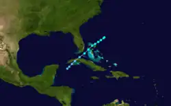 A tropical depression formed over the northwestern Caribbean on September 25. Moving northeastward, the depression brushed Cuba's Isla de la Juventud on the following day and then made landfall on the main island along the north shore of the Gulf of Batabanó.[3] Havana observed a barometric pressure of 1,008 mbar (29.8 inHg),[4] the lowest in relation to the storm. Thereafter, the cyclone emerged into the Straits of Florida late on September 26 and then intensified into a tropical storm early the next day. Throughout September 27, the system crossed the northwestern Bahamas, including striking the Abaco Islands with winds of 50 mph (85 km/h).[3] After exiting the Bahamas on September 28, the cyclone weakened, possibly due to the approach of the previous storm, and was last noted several hours later.[4]
