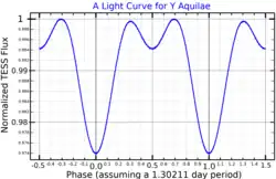 It took decades to determine whether or not 18 Aquilae is a variable star. It was used as a standard star in Benjamin Apthorp Gould's Uranometria Argentina, published in 1879. Gould marked the star with an asterisk, indicating that he thought it is a variable star.[10] Gustav Müller and Paul Kempf noted Gould's opinion in their 1894 work Potsdamer Photometrische Durchmusterung, but stated that their numerous observations did not confirm that the star is variable.[11] That same year, Seth Carlo Chandler reported that 18 Aquilae is a variable star. He stated the star showed an "unmistakable periodicity" and derived a period of 4.986 days - nearly 4 times larger than what the period is now known to be.[12] Chandler gave the star the name Y Aquilae. In 1898, Edward Charles Pickering and Paul S. Yendell announced that their observations of the star "fail to show any evidence of variation".[13] In 1966, Robert Arnold Breinhorst established that Y Aquilae is variable in his PhD thesis.[14]
