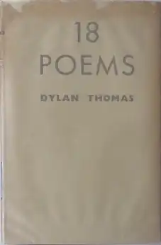 18 Poems is a book of poetry written by the Welsh poet Dylan Thomas, published in 1934 as the winner of a contest sponsored by Sunday Referee. His first book, 18 Poems, introduced Thomas's new and distinctive style of poetry.[1] This was characterised by tightly metered, rhyming verse and an impassioned tone. Written in his "womb- tomb period",[2] the poems explore dark themes of love, death and birth, employing a rich combination of sexual connotations and religious symbolism. The lyricism and intensity of the poems in the book contrasted with the emotional restraint shown in the poetry of the successful modernist poets that worked as his contemporaries. The book received critical acclaim, but was not initially commercially successful.[3]