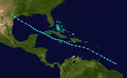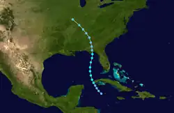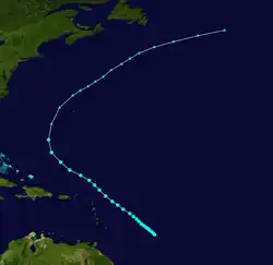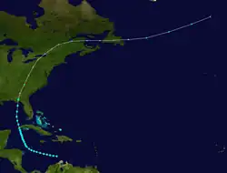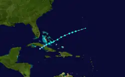 A tropical storm was first observed about 700 mi (1,100 km) east of Guadeloupe early on September 9. The system tracked generally westward and deepened slowly. On September 11, the grazed several islands of the northern Lesser Antilles, including Barbuda, Saint Barthélemy, and Saba. Early the following day, the cyclone struck Puerto Rico with winds of 60 mph (95 km/h), several hours before making made landfall in Dominican Republic near Punta Cana at the same intensity. The storm weakened while crossing Hispaniola, before emerging into the Caribbean Sea early on September 13. While passing to the south of Cuba, the system intensified, becoming a hurricane on September 14 near Cayman Brac. Early the following day, the storm peaked with sustained winds of 80 mph (130 km/h) and a minimum pressure of 1,001 mbar (29.6 inHg),[4] the latter was measured by a ship while the former was estimated during reanalysis.[14] The hurricane soon curved west-northwestward and later passed near Cape San Antonio, Cuba, on September 15. Upon entering the Gulf of Mexico, the cyclone weakened to a tropical storm. By September 17, it turned north-northeastward and made landfall in Fort Walton Beach, Florida, at 20:00 UTC with winds of 60 mph (95 km/h). The system then moved rapidly northeastward and became extratropical about 75 mi (120 km) east of Hatteras Island in North Carolina late on September 18. The remnants dissipated offshore New England about 24 hours later.[4]