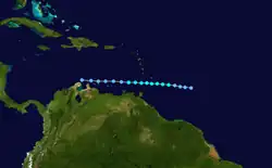 A tropical depression developed about 415 mi (670 km) south-southwest of Paramaribo, Suriname, on August 18. The system moved just north of due west throughout its duration and deepened into a tropical storm about 24 hours later. On August 20, the cyclone peaked with maximum sustained winds of 50 mph (80 km/h). Late on August 20, the storm passed through the Windward Islands just north of Grenada.[4] According to Governor-in-Chief of the Windward Islands Robert Baxter Llewelyn, no damage occurred on Grenada. At Barbados, three lighters and a schooner, the Myosettis, were wrecked. The jetties and vessels at them were destroyed on Saint Vincent.[6] After reaching the Caribbean, the cyclone began weakening, probably due to colder sea surface temperatures and the storm's proximity to South America.[14] On August 21, the cyclone weakened to a tropical depression. Continuing westward, it dissipated at 18:00 UTC on the following day while situated about 65 mi (105 km) west-northwest of Aruba.[4]