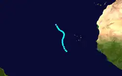 Ships reports and historical weather maps indicated that the storm was first observed early on September 12,[14] while located about 345 mi (555 km) southwest of Brava in the Cape Verde Islands. The system strengthened slowly while moving north-northwestward and later north-northeastward across the eastern Atlantic. Early on September 14, the cyclone peaked with maximum sustained winds of 60 mph (95 km/h). Thereafter, it curved northwestward and began to deteriorate very slowly, weakening to a tropical depression late on September 17. Soon after, the system dissipated about 505 mi (815 km) northwest of Santo Antão.[4]