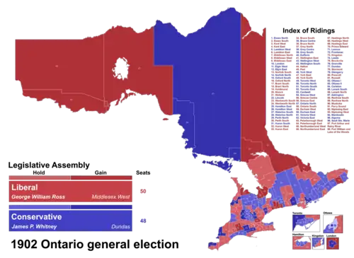 The 1902 Ontario general election was the tenth general election held in the province of Ontario, Canada. It was held on May 29, 1902, to elect the 98 Members of the 10th Legislative Assembly of Ontario ("MLAs").[1]