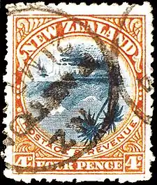 The 4d stamp depicts Lake Taupō in New Zealand's North Island. It was part of the first pictorial series originally issued in 1898 but reissued in different colours and sizes in 1899 and 1900.[3] The same design was used for a 1d value issued in 1898.[3]