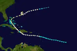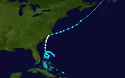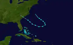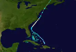 Historical weather maps indicate the presence of a tropical storm about 535 mi (860 km) east-northeast of Barbados on September 7.[1][5] Moving west-northwestward, the storm passed just north of the Lesser Antilles and slowly intensified, becoming a hurricane just offshore the Dominican Republic early on September 11. Thereafter, the cyclone strengthened more quickly, becoming a Category 2 hurricane just prior to striking Inagua in the Bahamas several hours later with winds of 100 mph (160 km/h). Around 12:00 UTC on September 12, the system strengthened into a Category 3 hurricane and peaked with maximum sustained winds of 120 mph (190 km/h) by early the following day. The storm curved northward and passed over or near several islands on September 13 and September 14, including Exuma, Cat Island, and Eleuthera. Later on September 14, the cyclone turned northeastward and exited the island chain. While traversing the open Atlantic, the system slowly weakened and remained a hurricane until falling to tropical storm intensity late on September 18 while just offshore Newfoundland. The storm soon struck the island and became extratropical near Port Rexton. The extratropical remnants continued northeastward and dissipated over the Labrador Sea late the following day.[1]
