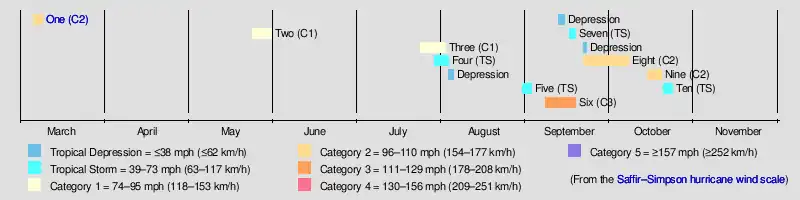 Tropical cyclogenesis began on March 6, 1908, when the first system was initially detected northeast of the Lesser Antilles.[1] It was the only off-season Atlantic tropical cyclone to reach Category 2 strength since the beginning of official records in 1851.[2] On May 24, the next system developed near the Turks and Caicos Islands. When it intensified into a hurricane on May 28,[1] the 1908 season became the only on record in which two systems reached hurricane status prior to the month of June.[3] Thereafter, activity ceased for nearly two months, until the third cyclone formed northeast of the Bahamas on July 24, followed by another system forming in the northwestern Gulf of Mexico on July 29.[1] The month of August featured two cyclones, a tropical depression and a tropical storm.[4] September was the most active month, with five systems developing, including two hurricanes, one tropical storm,[1] and two tropical depressions.[4] In October, a hurricane and a tropical storm developed, the latter of which became extratropical on October 23, ending seasonal activity.[1]