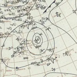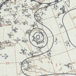 On Guadeloupe, the storm uprooted many trees, severely damaged sugarcane crops, and deroofed sugar factories. Communications were also disrupted.[5] The captain of the Dutch steamer Prins Willem V. reported considerable damage in Haiti.[29] In Cuba, the hurricane destroyed several buildings, including the custom house, which was under construction. Many fruit groves suffered substantial damage.[30] The storm produced hurricane-force winds and heavy precipitation over the western Bahamas.[5] At Nassau, sustained winds reached 80 mph (130 km/h). Much of New Providence was inundated due to rainfall amounts up to 7 in (180 mm). Property damage was generally light, however, with only smaller dwellings and outbuildings being demolished. Several large vessels capsized in the vicinity of the island,[31] resulting in six deaths.[32] On the Abaco Islands, several buildings at a timber company's plant, one home, and several huts were destroyed. Eleuthera also reported extensive damage, including the destruction of a mission house, a chapel, and several other buildings. The storm toppled many coconut trees, while one plantation alone lost about 300 banana trees.[33] Throughout the Bahamas, this storm, combined with the hurricane in mid-September, resulted in the near total loss of grapefruit, orange, and sisal crops. Additionally, the cyclone downed a number of trees and destroyed many gardens.[31] Heavy rains and high winds also pelted Bermuda, damaging a number of structures.[30]