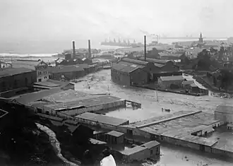 The flood caused significant destruction as it surged through the town, particularly in the produce section. The main stream followed Commerce Street, cutting off the Customs House located 250 yards from the river. Numerous buildings collapsed and extensive property damage occurred, with entire stores demolished and their contents, including produce and merchandise, scattered for miles along the North End Beach. The Harbour Board plant and the Port Elizabeth Electric Tramway power station also suffered serious damage.[4]
