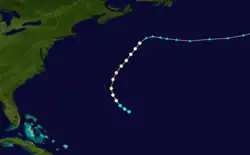 In the Atlantic hurricane database, the fourth hurricane of the season is listed as having formed on September 24, several hundred miles southeast of Bermuda. Strengthening, the storm moved northwestward and is estimated to have peaked with maximum sustained winds of 100 mph (155 km/h). It gradually turned toward the northeast as it bypassed Bermuda to the east. On September 27, it transitioned into an extratropical cyclone and turned eastward. It dissipated several days later.[5] The storm caused some damage to property on the island, and blew a barque aground.[1]