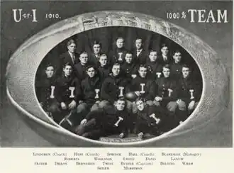 The 1910 Illinois Fighting Illini football team was an American football team that represented the University of Illinois as a member of the Western Conference during the 1910 college football season. In their fifth season under head coach Arthur R. Hall, the Illini compiled a perfect 7–0 record (4–0 in conference games), won the Western Conference championship, and outscored opponents by a total of 89 to 0.[1][2]