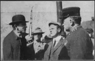 Soon after the strike began, organized labor advocates and socialists from the surrounding area began to come to Little Falls to help the strikers.[40] In Schenectady, located about 55 miles (89 km) down the Mohawk River from Little Falls, Mayor George R. Lunn, a member of the Socialist Party of America, recruited many to come with him to Little Falls to help organize the strikers and recruit more textile workers to join in picketing.[40] While Mayor Lunn wished to hold a rally at Clinton Park (an area located directly across the street from the Phoenix Mill),[33] city authorities took advantage of local ordinances to bar the socialists from holding the meeting, with one ordinance requiring permits from city officials to hold a rally and another forbidding gatherings of over 20 people in public.[41] These ordinances were often enforced inconsistently, as previous political rallies by Democratic politicians William Sulzer and Martin H. Glynn had been allowed, but were invoked to prevent socialists who attempted to speak at the park.[42] Local law enforcement officials were highly sympathetic to the mill owners,[34][19] and both Herkimer County Sheriff James W. Moon and Little Falls Police Chief James "Dusty" Long stated that speeches by the socialists could possibly provoke a riot and further civil unrest.[43] Many activists who attempted to speak in favor of the strike were arrested on charges of disturbing the peace or blocking traffic,[42] including Mayor Lunn himself on October 15.[44][35][15] Lunn refused to pay a $50 fine and was sentenced to a 50-day jail sentence.[45] Regarding the strike and involvement of the socialists, Police Chief Long stated, "We have a strike on our hands and a foreign element to deal with. We have in the past kept them in subjugation and we mean to continue to hold them where they belong".[34][19] In addition to law enforcement, local media institutions were also critical of the strike, with the Little Falls Journal and Courier expressing disapproval of the workers' decision to strike, saying, "The question of whether the wages paid were starvation or not, did not, and cannot enter into the merits of the case. The employer fixed the wages that he was willing to pay, and the men were at liberty to accept the employment or not. ... There were no extraordinary conditions, no disturbances, no suffering, no distress, so far as anyone here knew".[15]
