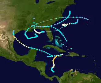 Observations from ships first indicated the presence of a tropical storm to the southeast of the Cayman Islands on October 11.[4] Moving west-northwestward, the storm strengthened steadily, reaching winds of 70 mph (110 km/h) before making landfall near Cancún, Quintana Roo, early on October 13. The system weakened slightly over land and while situated in the Gulf of Mexico just north of the Yucatán Peninsula, but began re-intensifying later that day. By 12:00 UTC on October 14, the cyclone deepened into a Category 1 hurricane and then a Category 2 hurricane about 24 hours later. The hurricane made landfall on central Padre Island between Corpus Christi and Port Mansfield in Texas late on October 16 with winds of 100 mph (155 km/h),[5] estimated based on a storm surge of 6 ft (1.8 m). A barometric pressure of 970 mbar (29 inHg) was estimated using the pressure-wind relationship.[4] The system quickly weakened to a tropical storm early on October 17, several hours before weakening to a tropical depression. The storm dissipated early on October 18.[5]