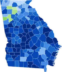 | Tattnall | 592 | 69.89% | 18 | 2.13% | 234 | 27.63% | 3 | 0.35% | 358 | 42.27% | 847 |