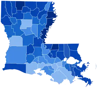 | West Baton Rouge | 170 | 83.33% | 19 | 9.31% | 15 | 7.35% | 0 | 0.00% | 151[c] | 74.02% | 204 |