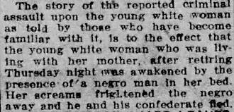 In Forsyth County, Georgia, in September 1912, two separate alleged attacks on white women in the Cumming area resulted in black men being accused as suspects. First, a white woman reportedly awoke to find a black man in her bedroom; then days later, a white teenage girl was beaten and raped, later dying of her injuries.
